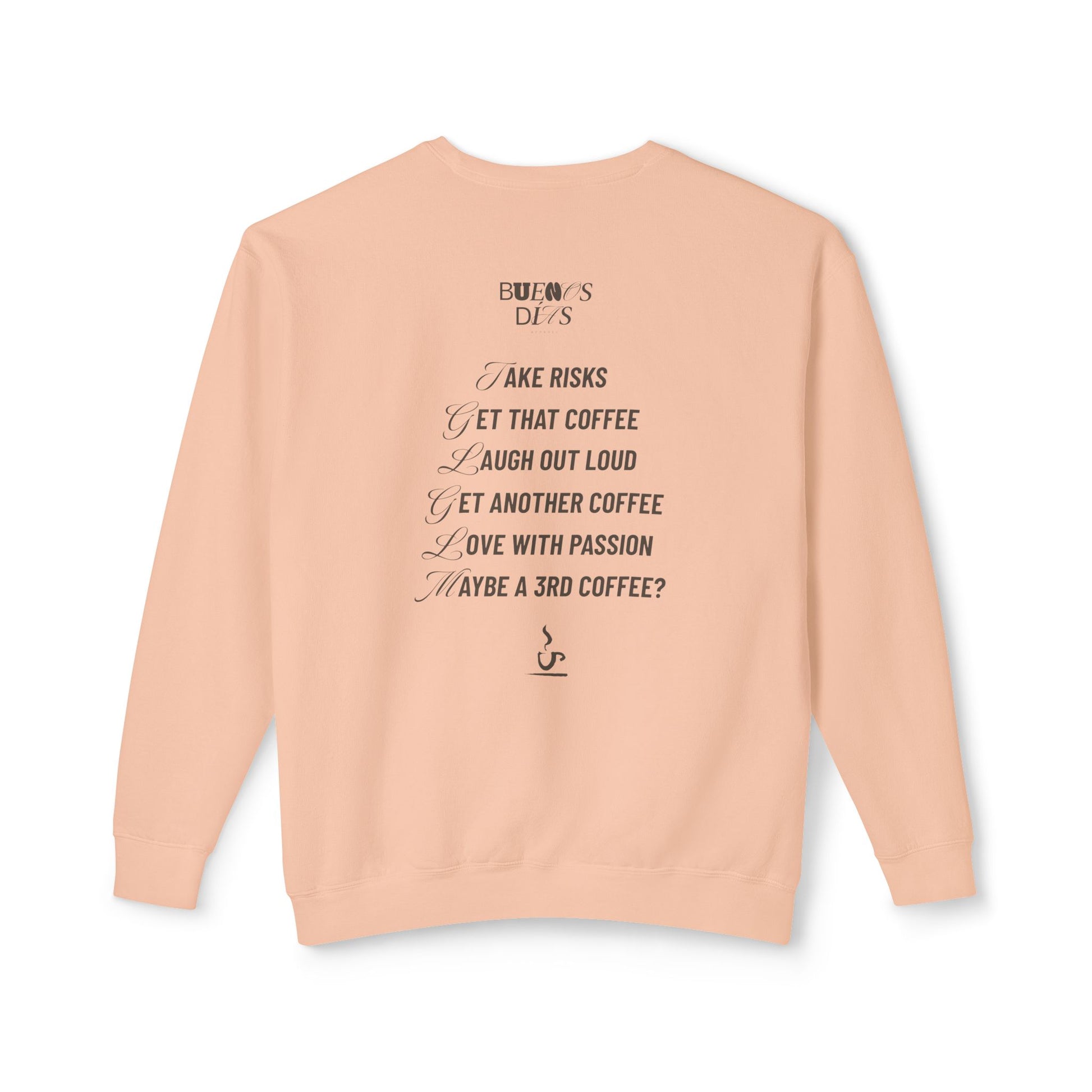 This playful sweatshirt is a fun reminder to live life to the fullest. Perfect for anyone who enjoys a good laugh, takes chances, and knows that a strong cup of coffee is always part of the journey.